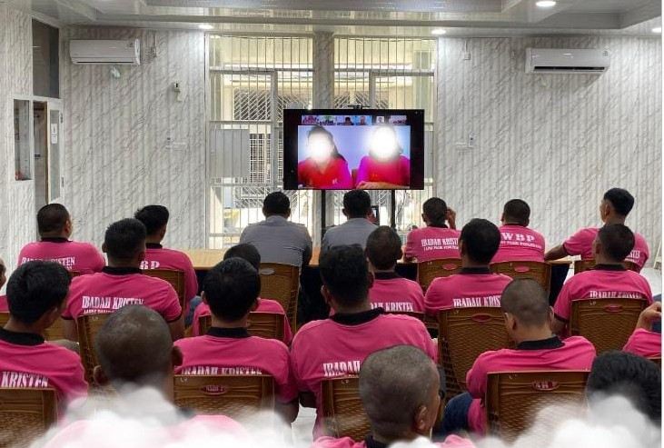RIAUMERDEKA-Meningkatkan kerohanian, Warga Binaan Pemasyarakatan (WBP) di Lembaga Pemasyarakatan (Lapas) Kelas IIB Pasir Pengaraian mengikuti ibadah secara virtual, Senin.