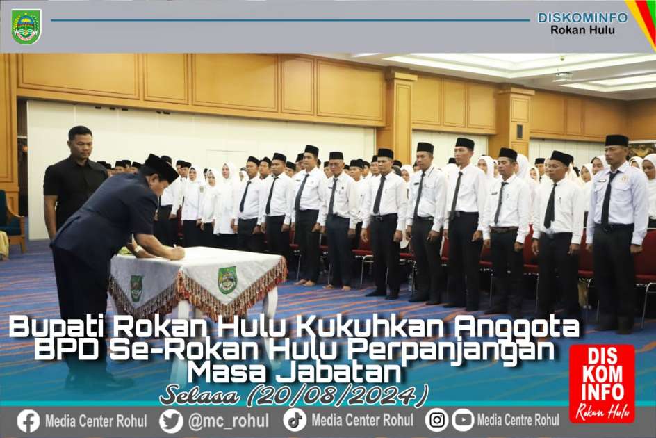 RIAUMERDEKA-Bupati Rokan Hulu H. Sukiman Secara Resmi Kukuhkan 739 orang anggota Badan Permusyawaratan Desa ( BPD) dari 139 desa se Rohul, selasa ( 20-08-2024 ) di aula Hall Islamic Center.