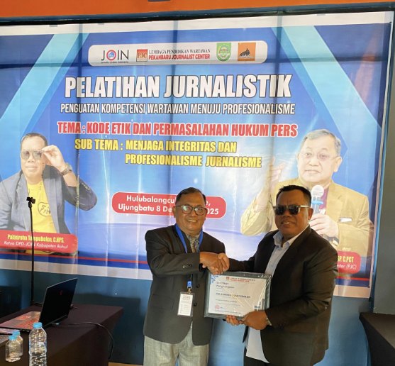 RIAUMERDEKA - Dewan Pimpinan Daerah Jurnalis Online (DPD-JOIN) Kabupaten Rokan Hulu (Rohul) bersama Lembaga Pendidikan Wartawan Pekanbaru Journalist Center (PJC) menyerahkan sertifikat kepada.