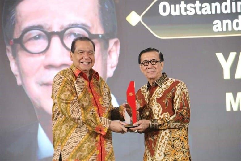 Medan-Menteri Hukum dan HAM, Yasonna H. Laoly, menerima penghargaan dari CNN Indonesia Awards 2024 dalam kategori "Outstanding Dedication to Law Enforcement and Anti-Corruption Movement"..
