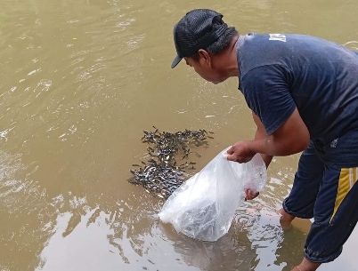 RIAUMERDEKA-Pemerintah Desa (Pemdes) Lubuk Bendahara Kecamatan Rokan IV Koto Kabupaten Rokan Hulu (Rohul), tabur benih Ikan Mas sebanyak 3000 ekor di Sungai.