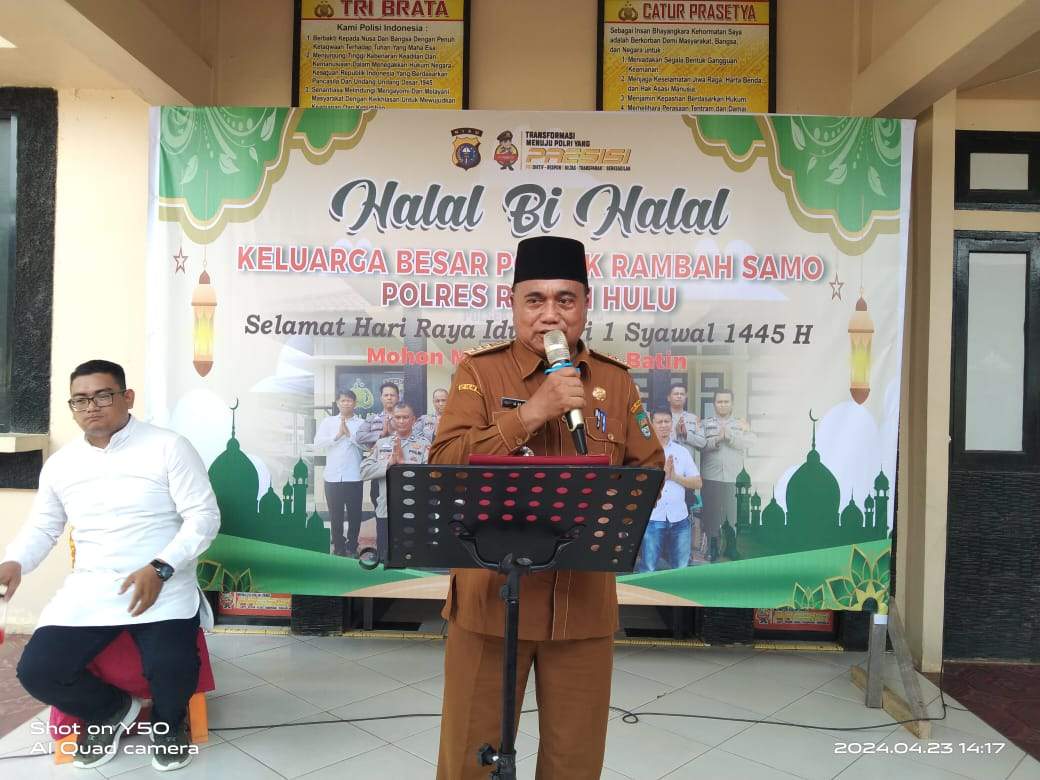 RIAUMERDEKA-Camat Rambah Samo hadiri acara Halal Bi Halal di Mapolsek Rambah Samo Kabupaten Rokan Hulu, (Rohul), Selasa (23/4/2024)..