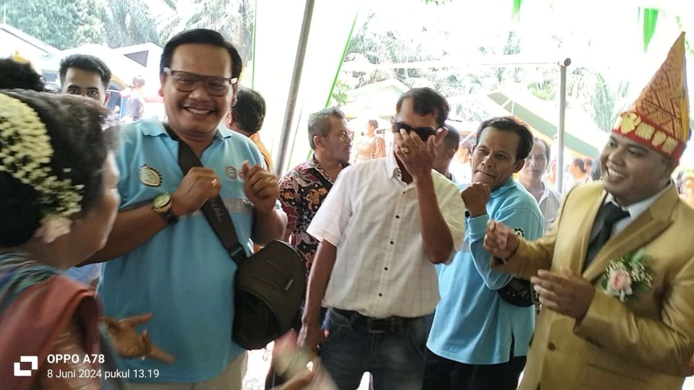 RIAUMERDEKA-Pimpinan Unit Kerja Federasi Serikat Pekerja Pertanian dan Perkebunan Sei Kuning Jaya (PUK F. SPPP SKJ) Desa Sei Kuning hadiri pesta pernikahan.