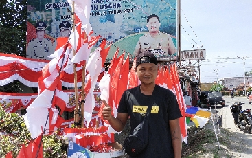 RIAUMERDEKA - Jelang Peringatan Hari Ulang Tahun (HUT) Kemerdekaan RI Ke 78, Sejumlah penjual Bendera, Assosoris dan Umbul-umbul di Jalan Sudirman Ujungbatu, Kabupaten Rokan Hulu (Rohul) terlihat.