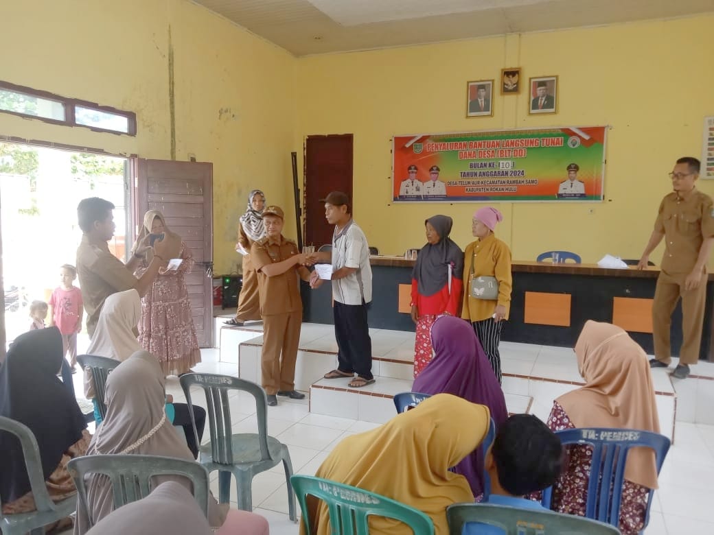 RIAUMERDEKA-Sebanyak 44 Warga Desa Teluk Aur Kecamatan Rambah Samo Kabupaten Rokan Hulu terima Bantuan Langsung Tunai(BLT) di Aula Desa Teluk Aur yang disalurkan oleh Kades Teluk Aur Muslim, SH didampingi perangkat desa.