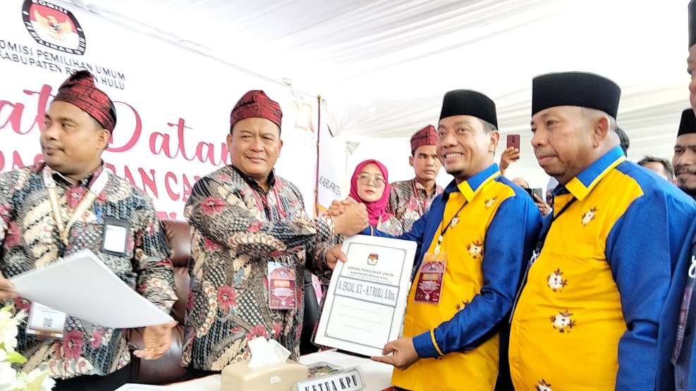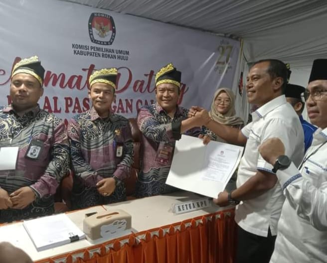 RIAUMERDEKA-5 Partai Politik (Parpol) pengusung mendaftarkan Pasangan Calon (Paslon) Bupati Rokan Hulu (Rohul) Kelmi Amri, SH dan Asparaini, S.Ag, M.Pd di Komisi Pemilihan Umum (KPU) Kabupaten Rohul, (28/8/2024) kemaren..