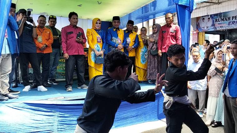 RIAUMERDEKA- Usai berdoa dipimpin langsung oleh H. Erizal ST dan pertunjukan pencak silat, Pasangan Calon Bersama H. Erizal ST - H.T Rusli,S.Sos (Paslon-Berseri) berangkat bersama pendukung ke kantor Komisi Pemilihan Umum (KPU) Rohul Jl Imam Kamis.