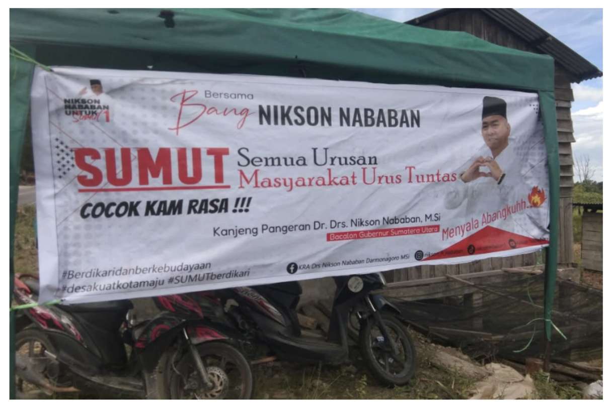 RIAUMERDEKA-Aliansi Rakyat For Nikson Nababan Kabupaten Toba bersama TIm, memasang spanduk Bakal Calon Gubernur Sumatera Utara (Balon-Gubsu) Dr.Drs.Nikson Nababan,M.Si sebanyak 5 titik dilokasi.