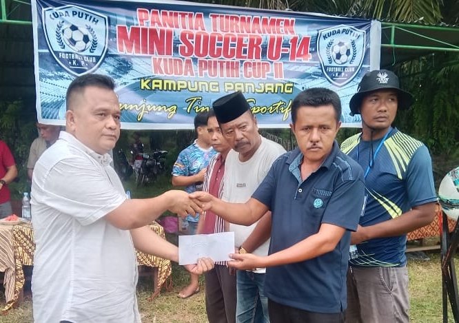 RIAUMERDEKA- Kepala Desa (Kades) Rantau Panjang Ihman Efendi buka Turnamen Mini Soccer U-14 Antar Desa se Kecamatan Tambusai dan Tambusai Utara di Lapangan Kuda Putih Desa Rantau Panjang, Kecamatan Tambusai, Kabupaten Rokan Hulu (Rohul), Rabu.