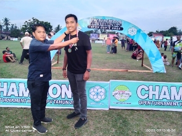 RIAUMERDEKA-Ketua Panitia Babusallam Cup 2023, Hasyudi Ucapkan selamat kepada tim pemenang pada Open turnamen Babusallam Cup tahun 2023 di Desa Babussalam, Kecamatan Rambah Kabupaten Rokan Hulu.