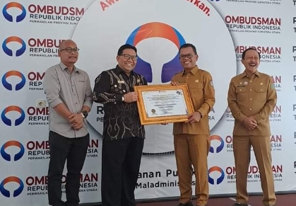 RIAUMERDEKA-Bupati Toba Poltak Sitorus, terima penghargaan dari Perwakilan Ombudsman RI Provinsi Sumatera Utara, Selasa.