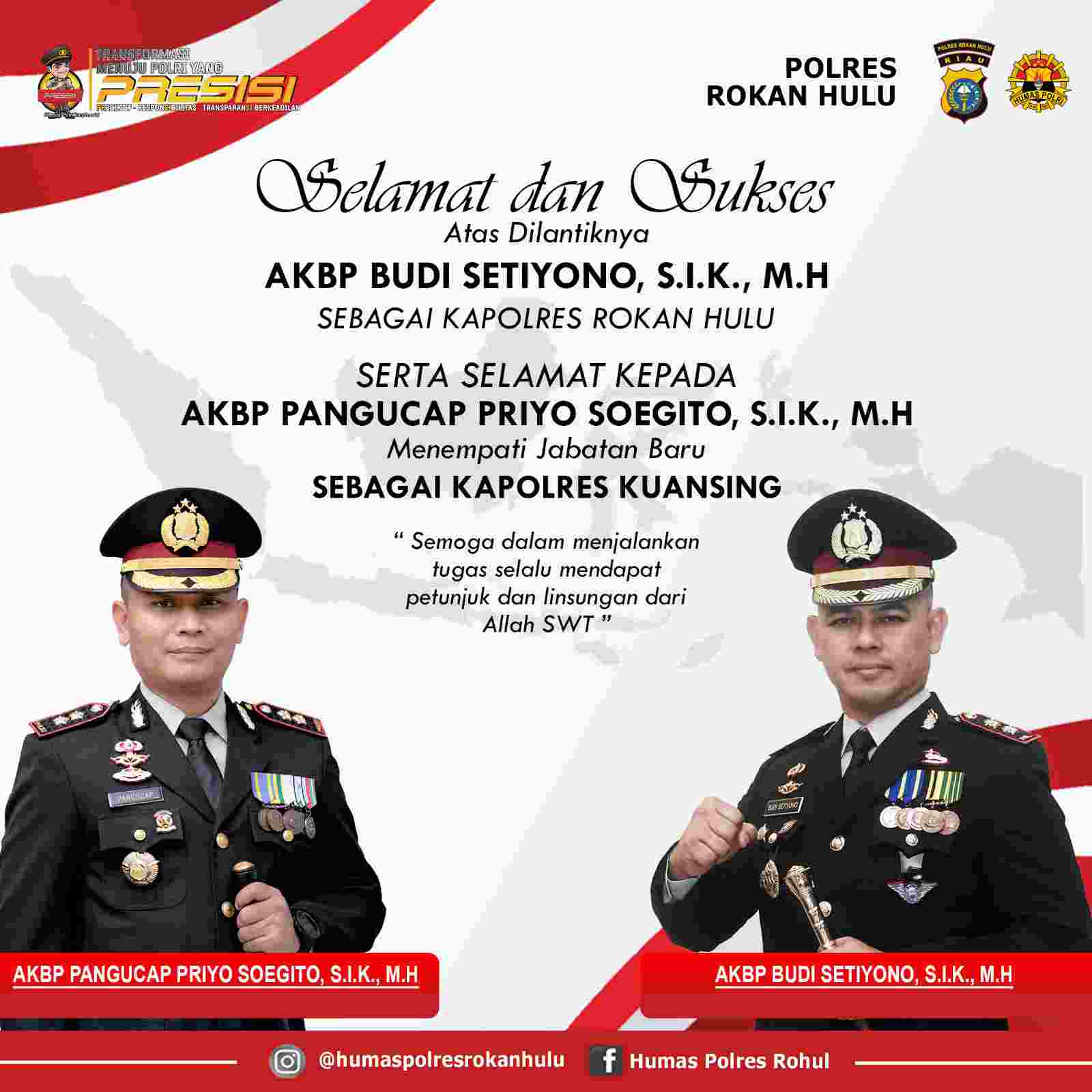 RIAUMERDEKA-Kapolres Kabupaten Rokan Hulu (Rohul), akan melaksanakan pisah sambut dari AKBP Pangucap Priyo Soegito,SIK.MH kepada AKBP Budi Setiyono,SIK.MH.